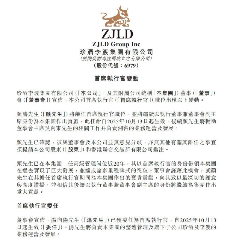 作为港股白酒第一股,珍酒李渡集团(6979.HK)的管理层变动始终牵动行业目光。10 月 13 日,集团正式发布高管任命公告,宣布两项核心人事调整:汤向阳出任集团首席执行官(CEO),全面负责整体运营;陪伴集团近 20 年的颜涛则卸任 CEO,转任执行董事兼董事会副主席,聚焦战略协助与湘窖业务。此次调整被业内视为珍酒李渡优化治理结构、强化酱香赛道竞争力的重要布局。