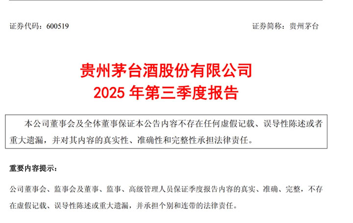 酱酒界讯:2025 年 10 月 29 日晚间,贵州茅台(证券代码:600519)发布 2025 年第三季度报告,公司董事会及全体董事保证报告内容真实、准确、完整,无虚假记载或重大遗漏。