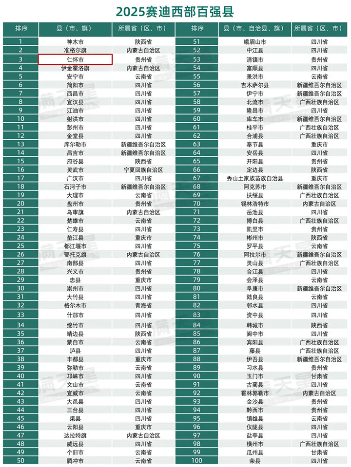 酱酒界讯:2025 年 11 月 12 日,赛迪顾问发布的 2025 赛迪西部百强县榜单引发行业关注。贵州省 9 个县(市)成功入围,其中作为中国酱酒核心产区的仁怀市,以强劲经济实力位列第三,仅次于陕西神木市、内蒙古准格尔旗,成为西南县域高质量发展的标杆。